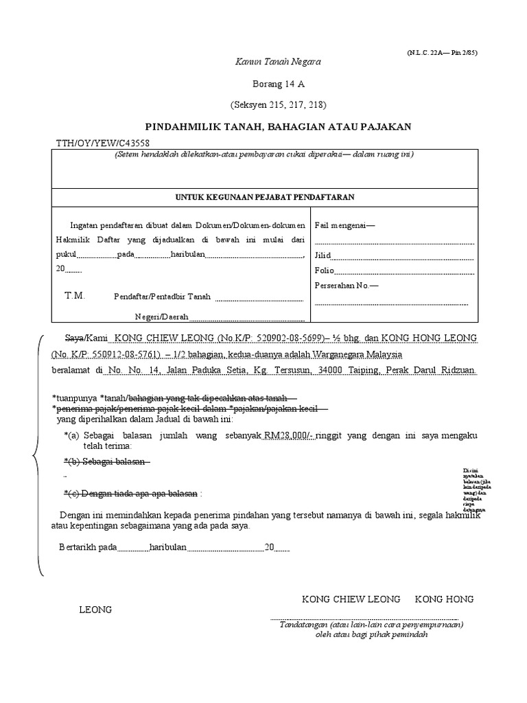 Pindahmilik tanah, bahagian atau pusaka. Sekiranya anda juga mempunyai templates untuk dikongsi bersama, bolehlah hantar kepada saya. 2 85 kanun tanah negara borang 14 a seksyen 215 217 218 pindahmilik tanah bahagian atau pusaka setem hendaklah dilekatkan atau pembayaran cukai di perakui dalam ruang ini. Aturan tanah kedah 1966 pindaan 2015. (borang ini diterjemahkan oleh peguam negara, malaysia, menurut pemberitahu undangan no.