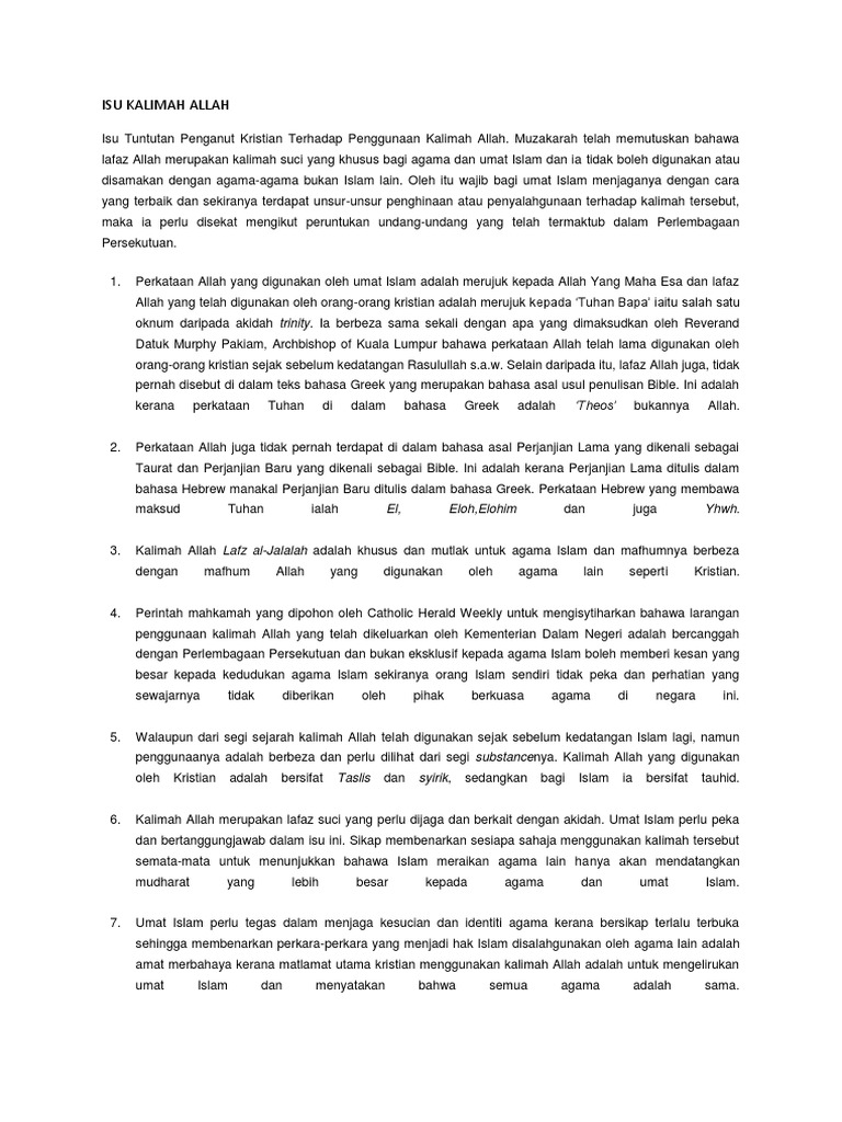 Isu Penggunaan Kalimah Allah Oleh Masyarakat Kristian. - Isu penggunaan kalimah allah oleh pengganut kristian paduka ayahanda azhar mohamad загрузил:. Penggunaan kalimah allah oleh masyarakat kristian khususnya. Isu pengunaan kalimah allah terhadap orang bukan islam isu penggunaan kalimah allah seperti yang digunakan oleh herald catholic dalam terbitan bahasa melayunya, memang telah termaktub di antara larangan yang telah dikeluarkan oleh kerajaan malaysia menerusi keputusan kabinet yang. Isu kalimah allah kenapa non muslim tak boleh guna kalimah allah. 3 februari 2010 — 0 comments. .isu penggunaan kalimah allah tidak harus dicampuri oleh ahli politik.