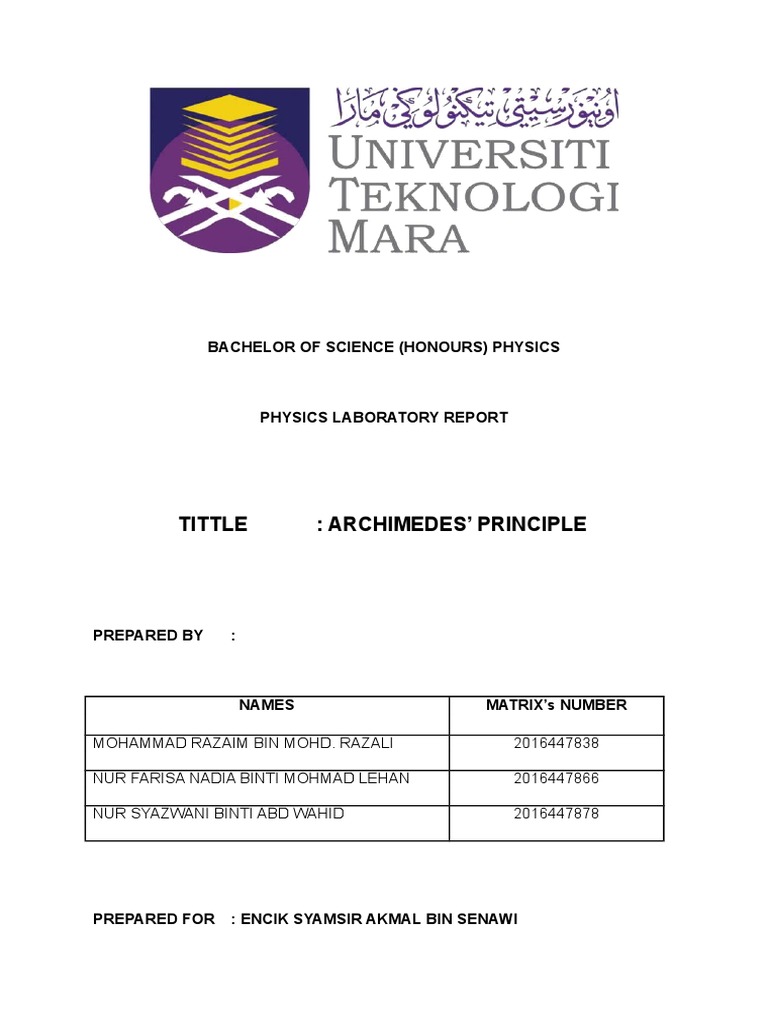 Related : Archimedes Principle Lab Report - Lab report archimedes' principle asim shabbir h00202705 29th november 2014 table of contents:.