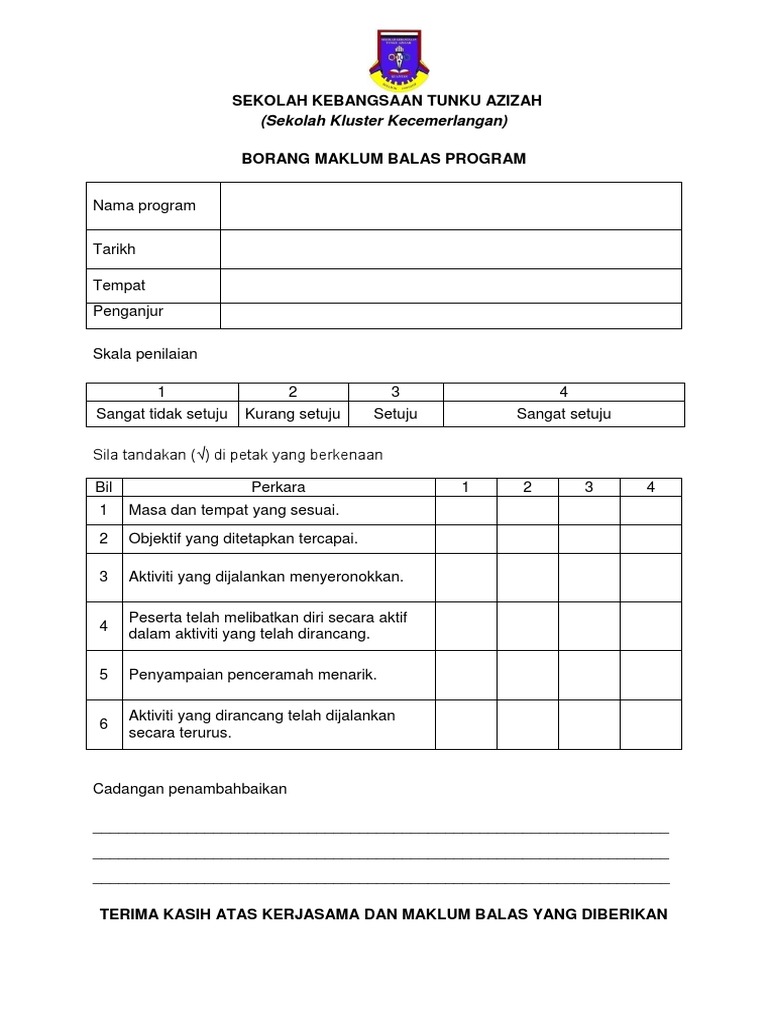 Sila isikan nama dan alamat penuh untuk tujuan surat menyurat. Contoh borang permohonan kerja borang resume, borang via newhairstylesformen2014.com. Kerjasama anda melengkapkan borang soal selidik ini didahulukan dengan ucapan ribuan terima kasih. Segala maklum balas yang anda berikan akan dirahsiakan. Contoh borang maklum balas mesyuarat 1 pdf pelajar murid 141622596 penilaian. Panduan laporan maklum balas pemerhatian audit. Related posts to surat rasmi maklum balas. Draf rancangan tempatan presint 11, putrajaya (pengubahan) 2025. Sebagai norma kerja, setiausaha sepatutnya telah menerima borang maklum balas 7 hari sebelum mesyuarat berikutnya. Th amat menghargai sebarang maklum balas/cadangan anda mengenai perkhidmatan yang tuan/puan terima dengan mengisi borang. Oleh yang demikian kami telah mengambil keputusan untuk manjalankan program motivasi ini dalam borang maklumbalas program motivasi. Borang maklum balas mesyuarat pengurusan. Kami mahu memastikan laman web ini berguna dan berinformasi sebaik mungkin.